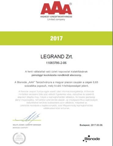 A LEGRAND ZRT. a Bisnode AAA (tripla A) tanúsítványát kapta meg, mellyel Magyarországon csupán a vállalkozások 0,63 %-a rendelkezik, és azt jelzi, hogy velünk az üzleti kapcsolat kialakításának pénzügyi kockázata rendkívül alacsony. Erre a minősítésre sem pályázni, sem jelentkezni nem lehet, ezért a Bisnode tanúsítvány szigorúan szakmai és független minősítése komoly elismerése munkánknak.