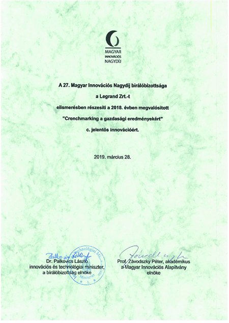 A Legrand Zrt. „Crenchmarking® a gazdasági eredményekért” című pályázatát a bizottság Okleveles elismerésben részesítette. A pályázat lényegi részében bemutatásra került Károlyi László vezérigazgató úr által kifejlesztett új módszer, a Crenchmarking®. Ez a módszer 5 lépésben ad iránymutatást a gondolkodás átalakítására, amely a szervezet és a folyamatok sikerét szolgálja. A Legrand Zrt. fejlődésében és eredményeiben ez a szemlélet tisztán nyomon követhető.