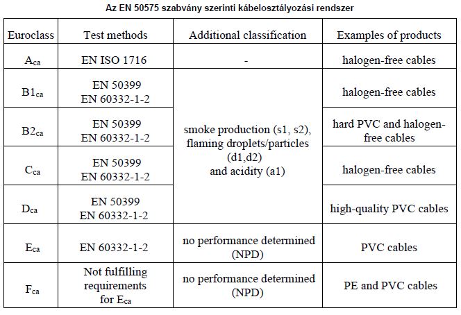 A CPR és az EN50575 szabvány szerint hét tűzveszélyes osztályozás található: Aca, B1ca, B2ca, Cca, Dca, Eca, Fca, továbbá a füsttermelést jellemző további kritériumok, a lángoló cseppek előfordulása/ részecskék és az égés