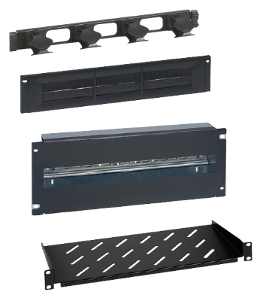 A Legrand rack szerkény kínálata természetesen nagy számban tartalmaz a 19” profilsínre rögzíthető kiegészítőket úgymint: vízszintes és kétirányú gyűrűs paneleket, zárt-tüskés kábelrendező paneleket, tömör és kefés előlapokat, kettő- és négyponton rögzíthető fix készüléktartó tálcákat 50 és akár 100 kg-os terhelehetőségű változatban, kihúzható tálcákat, kihúzható fiókokat, 19” ventilátor egységeket, világító készleteket, erősáramú paneleket IP2X védettséggel. A kínálat továbbá tartalmaz kifejezetten gyengeáramú kábelek rögzítéséhez használható műanyag és texil kötegelőket is.